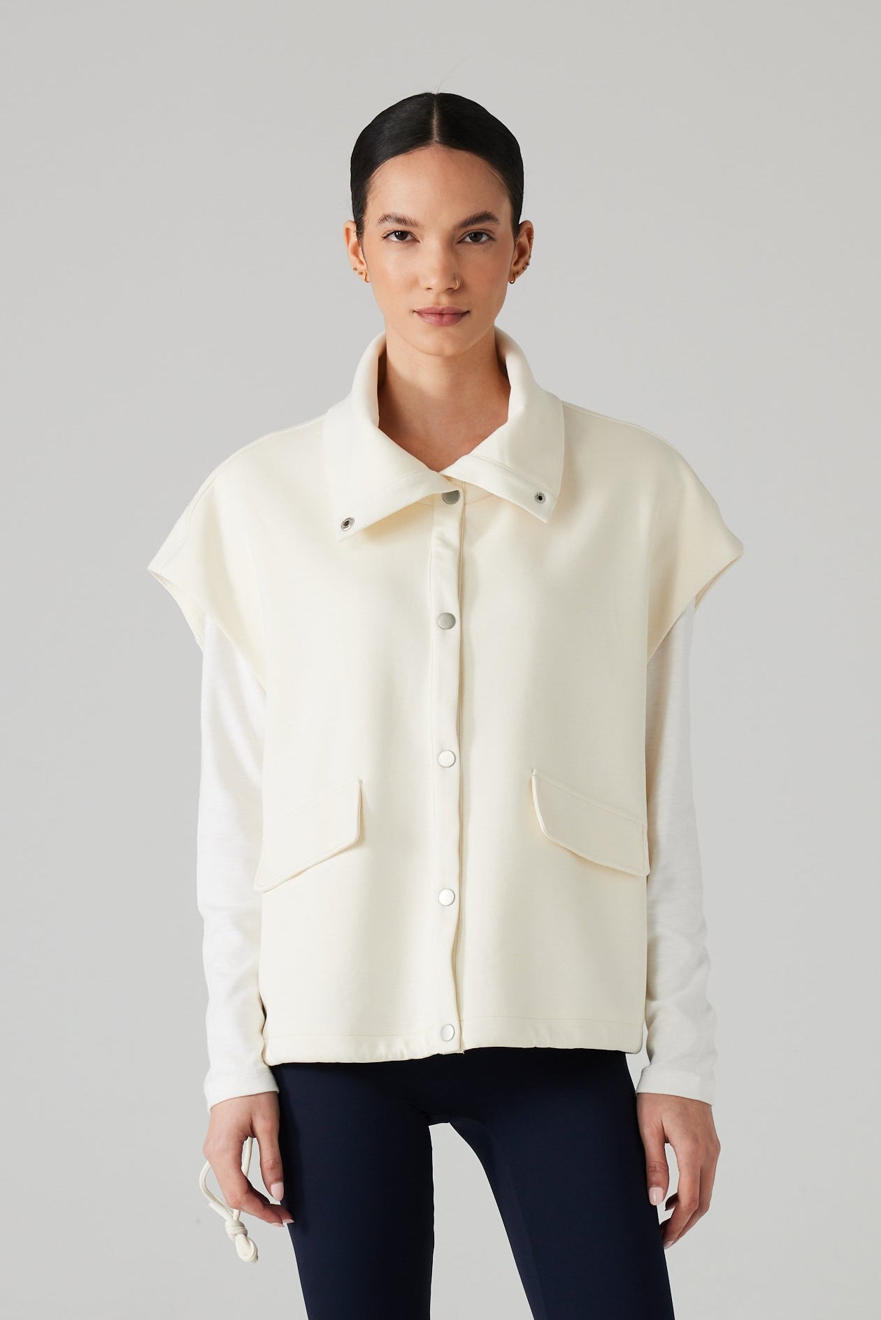With a softly padded feel, snap-button closure and adjustable drawstring hem, this vest adds warmth and structure to sporty looks or when layered over knits. Easy to wear for an effortless outfit.