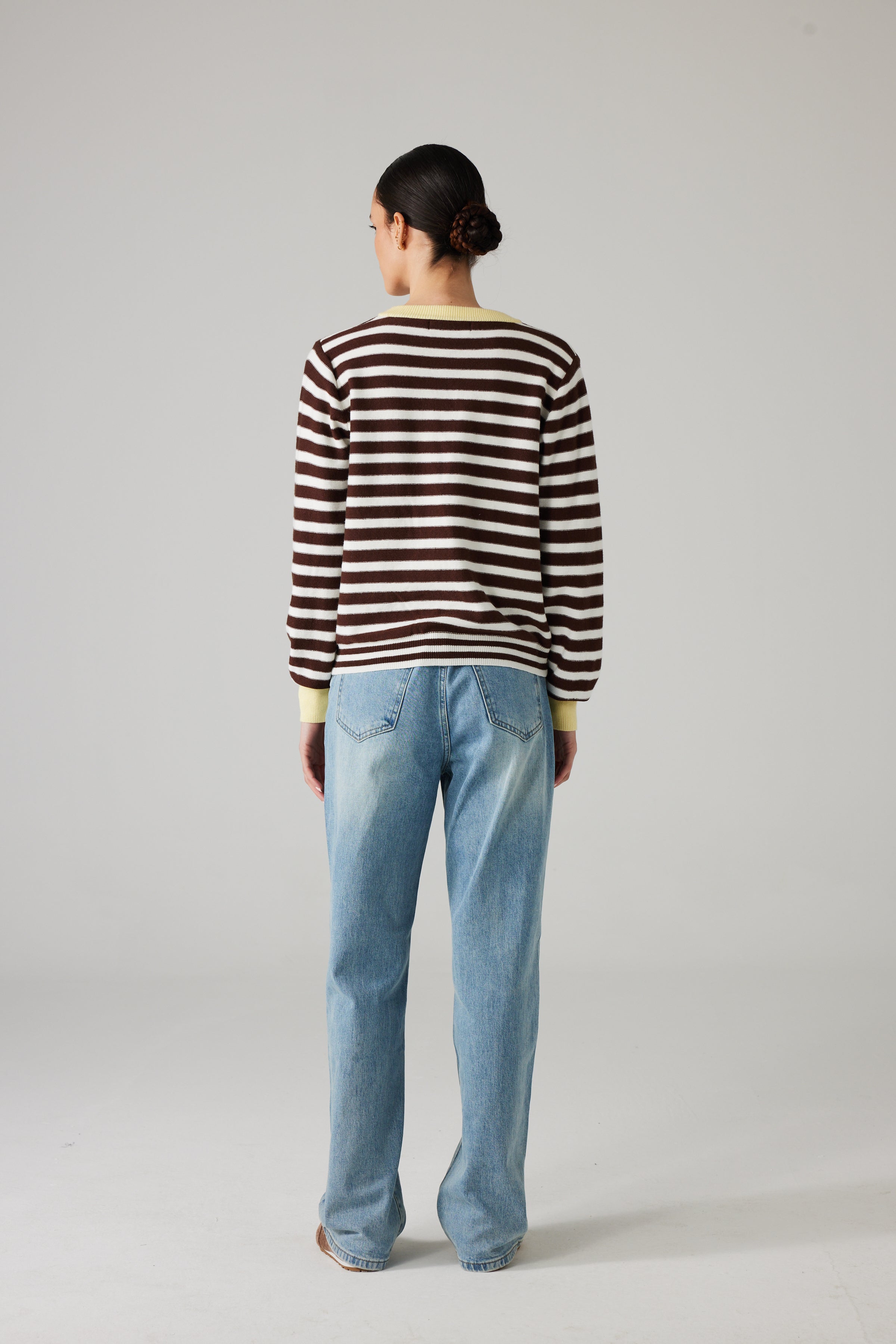 The Marin Striped Cardigan is an easy knit with a button front and contrast trims.