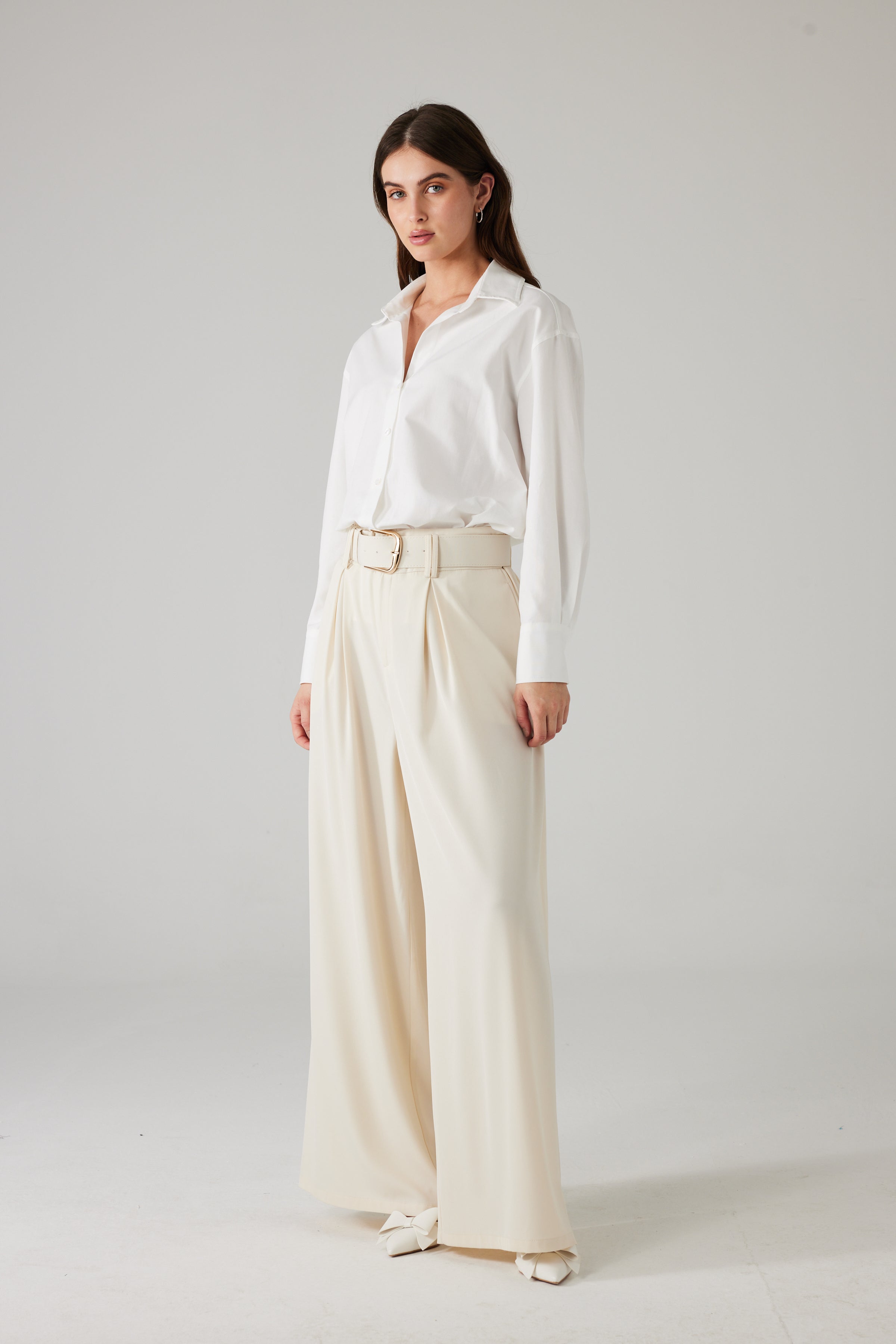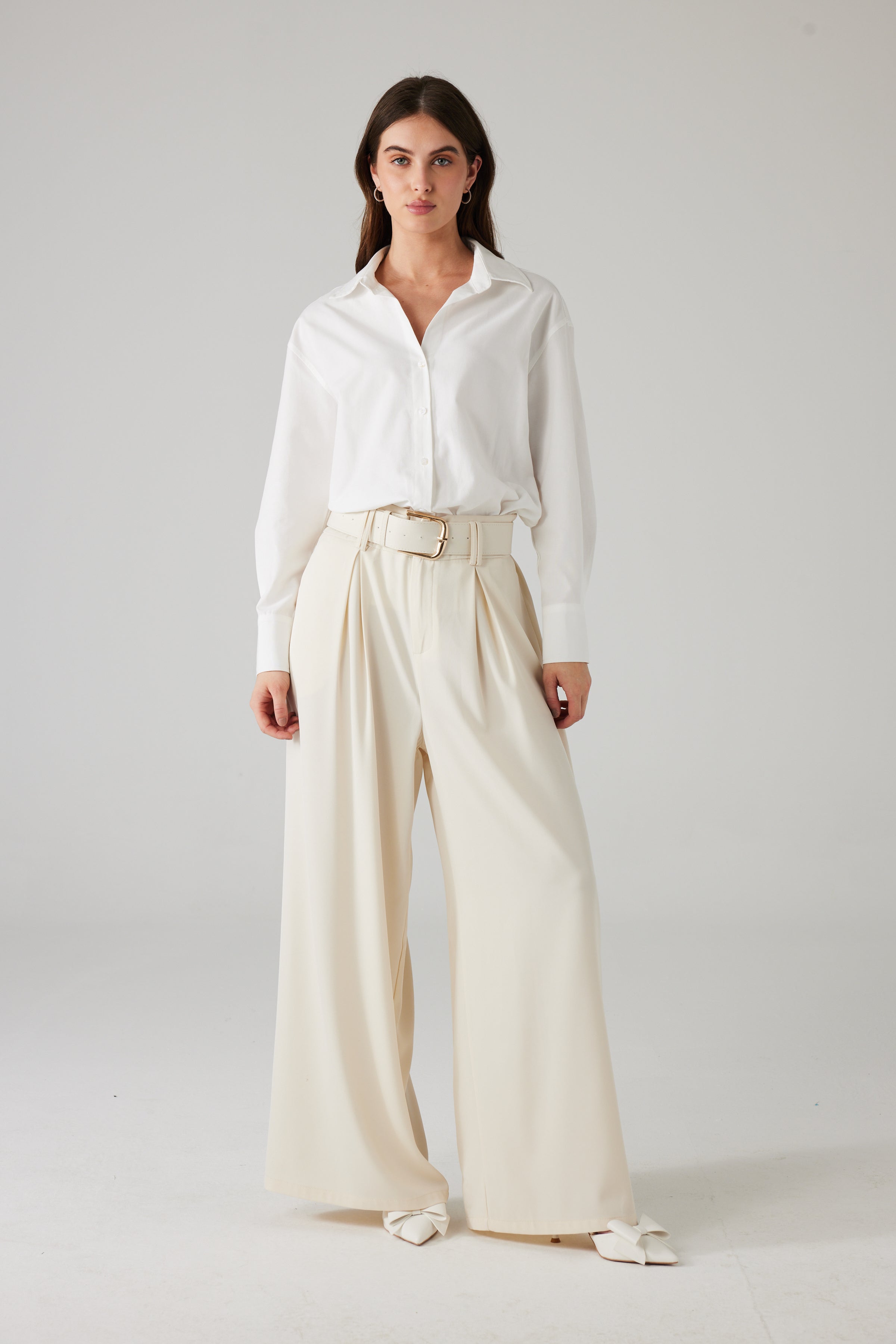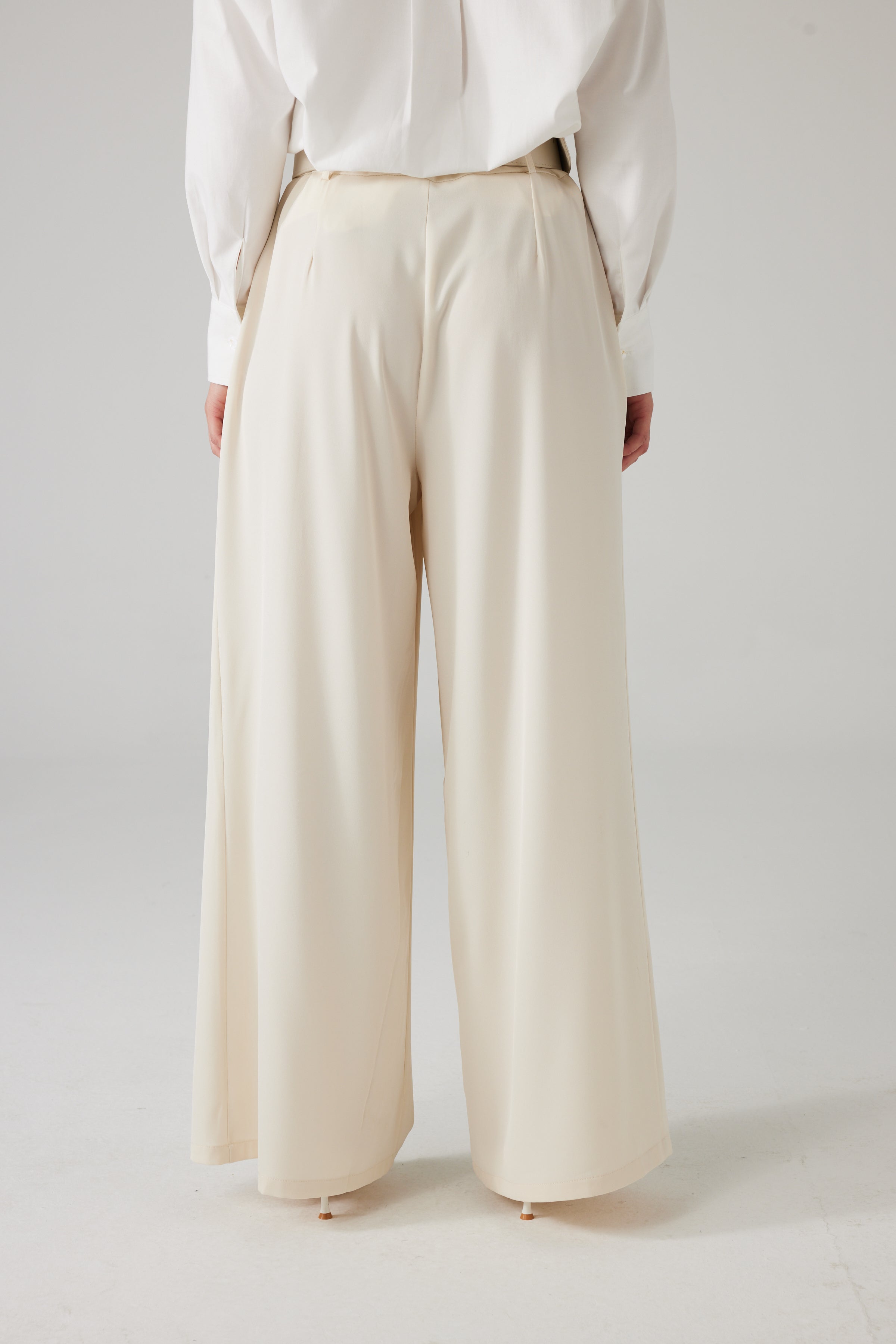 Crèmekleurige broek met wijde pijpen. De soepele stof valt licht en geeft het kledingstuk een elegante, getailleerde uitstraling.