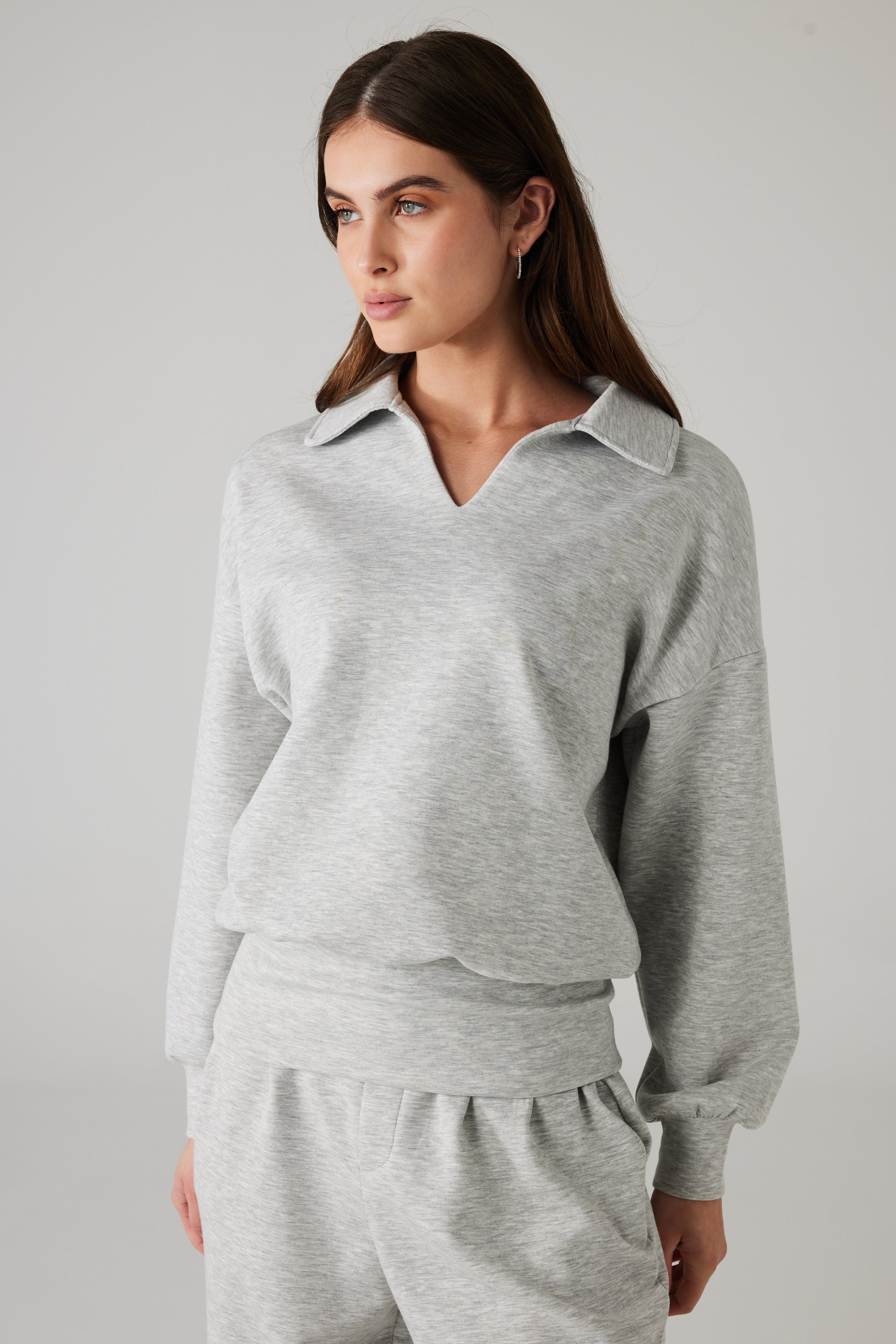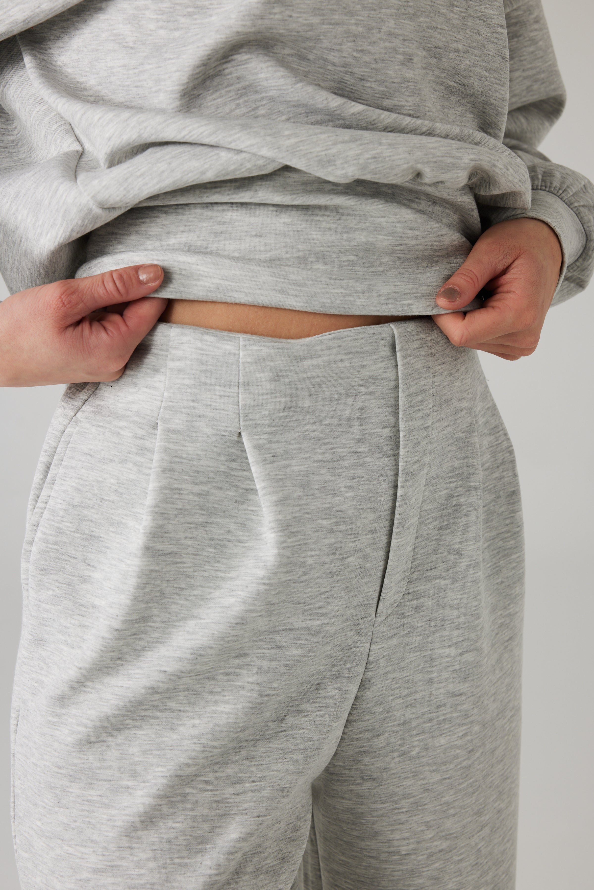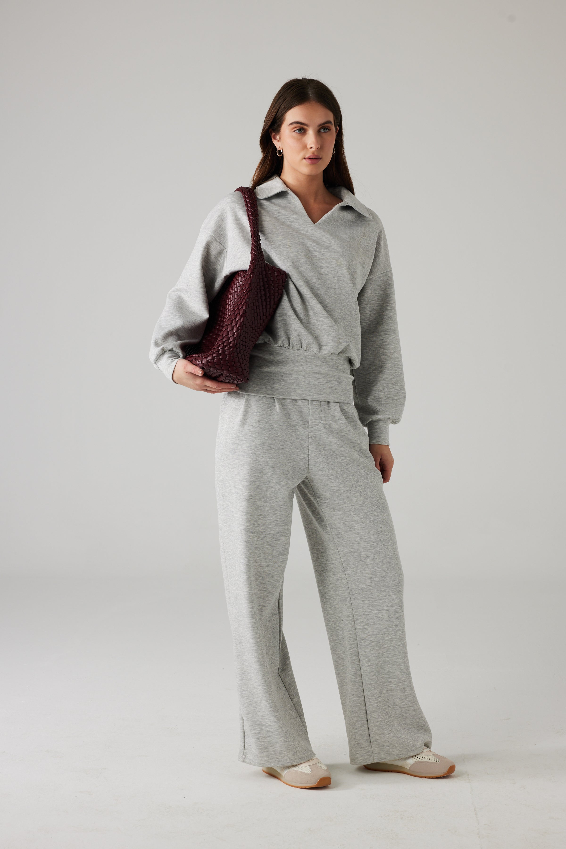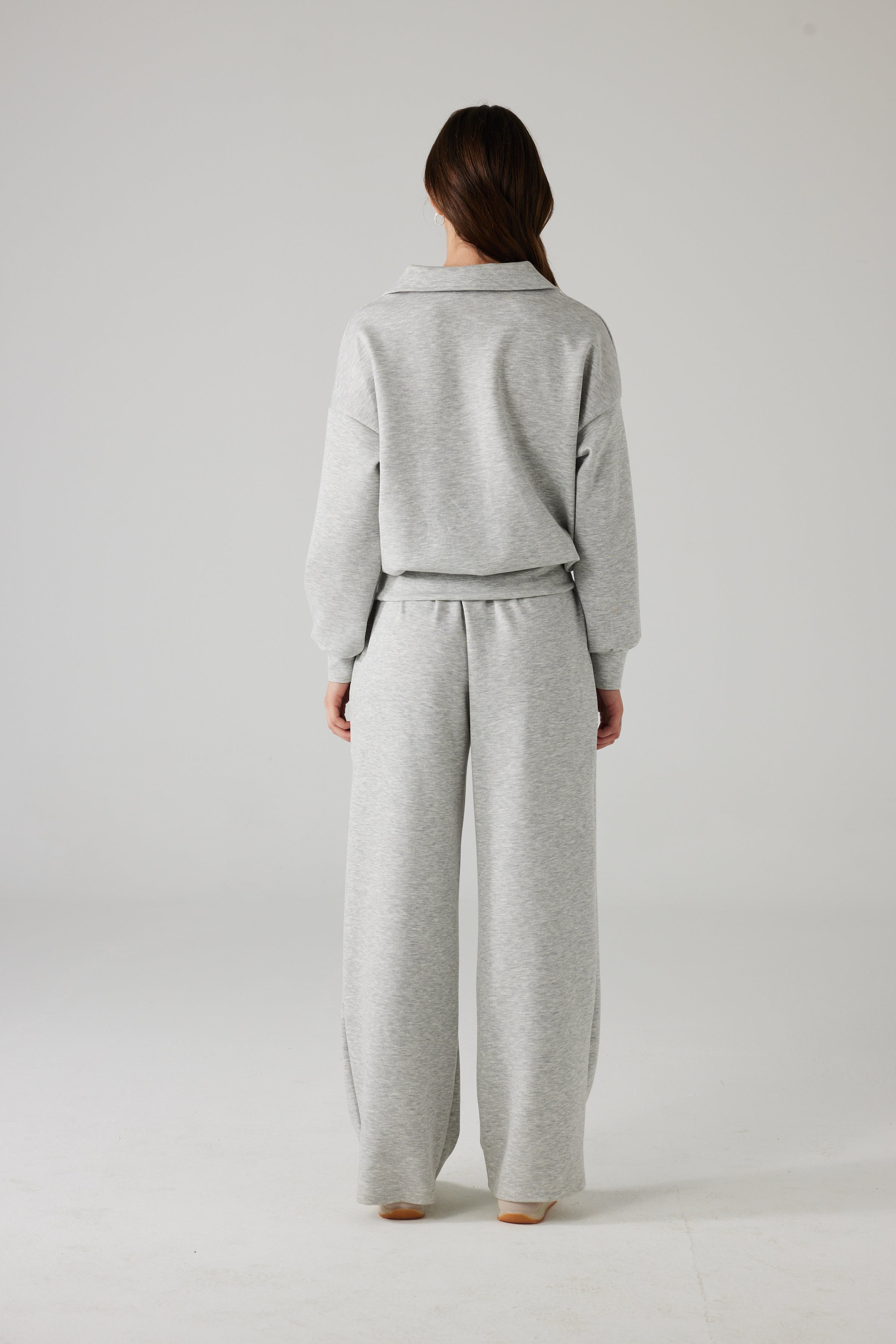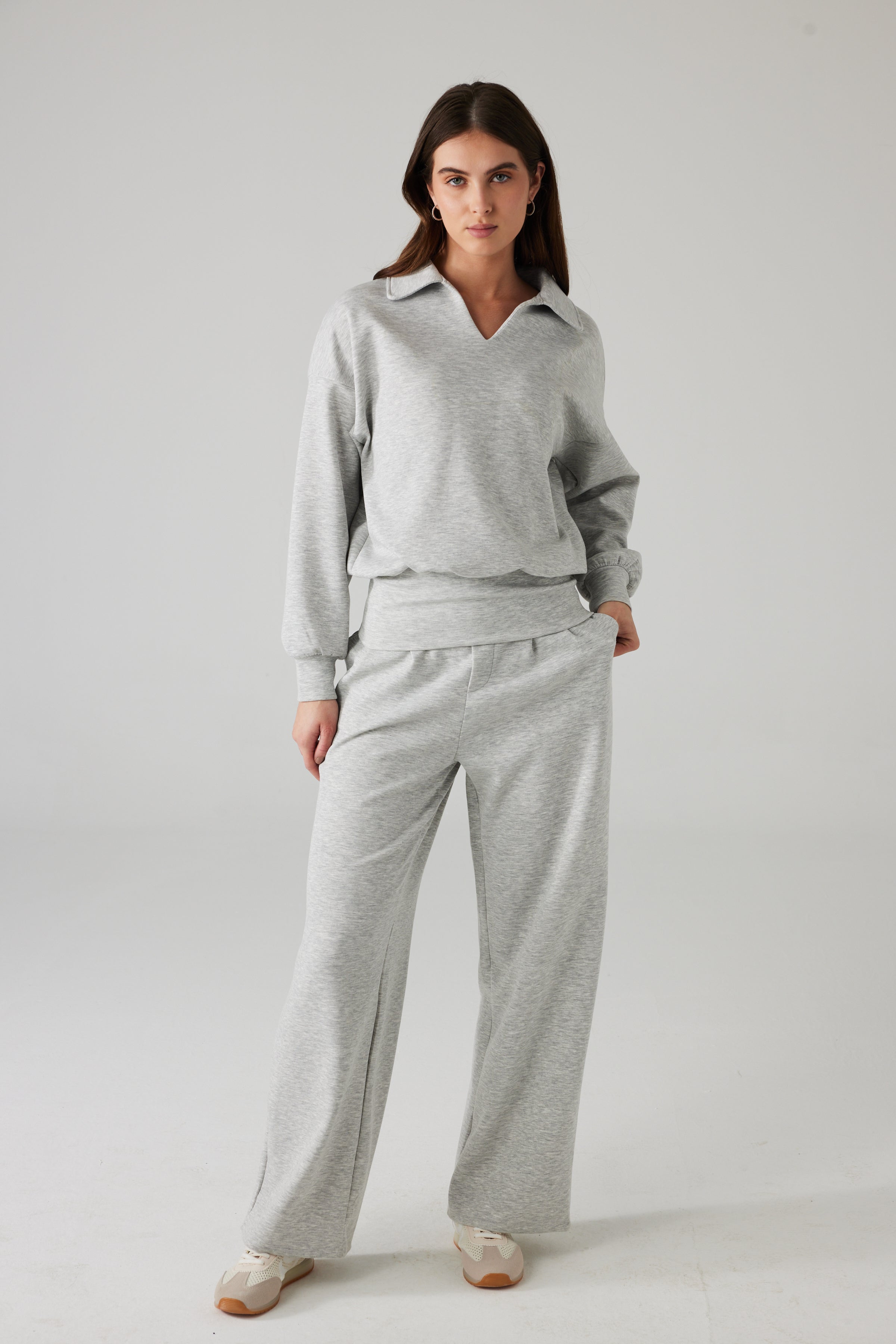 Deze set, bestaande uit een comfortabel topje met open kraag en een soepelvallende broek met wijde pijpen, creëert een moeiteloze, stijlvolle look voor zowel thuis als in de vrije tijd.