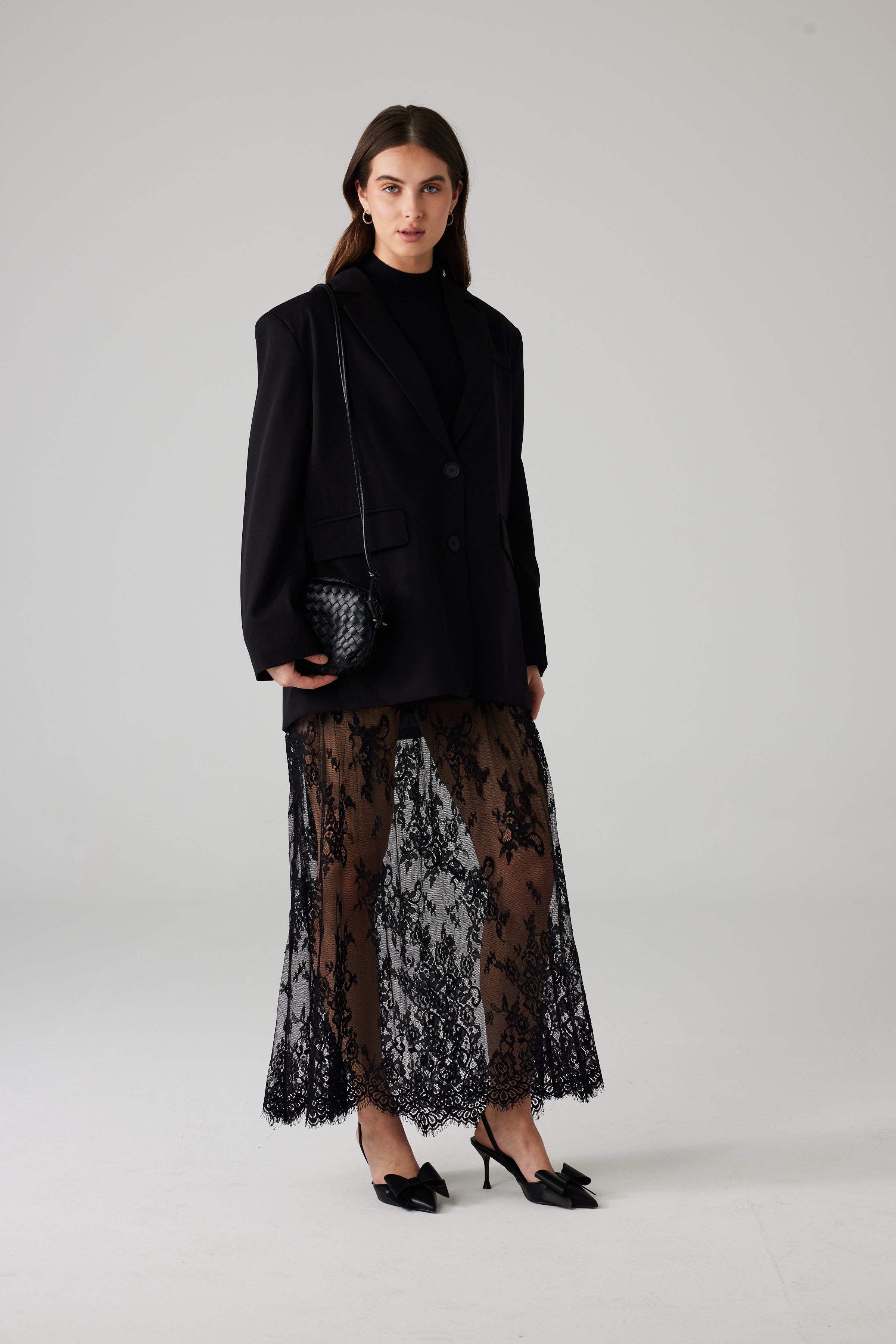 The flora long lace skirt is an elegant and timeless piece designed to elevate any wardrobe. Crafted from delicate lace with a flowing silhouette, it drapes beautifully for a feminine and sophisticated look. The sheer detailing adds a subtle touch of allure, while the full-length cut creates graceful movement with every step.